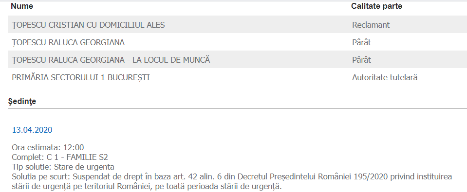 ”Soluția pe scurt: Suspendat de drept în baza art. 42 alin. 6 din Decretul Preşedintelui României 195/2020 privind instituirea stării de urgenţă pe teritoriul României, pe toată perioada stării de urgenţă”, a decis completul de judecată. CANCAN.RO, site-ul nr. 1 din România, vă va ține la curent cu desfășurarea evenimentelor. (CITEȘTE ȘI: STAREA DE URGENȚĂ DĂ PESTE CAP DIVORȚUL CELUI MAI BOGAT ROMÂN! INSTANȚA A DECIS CĂ…)