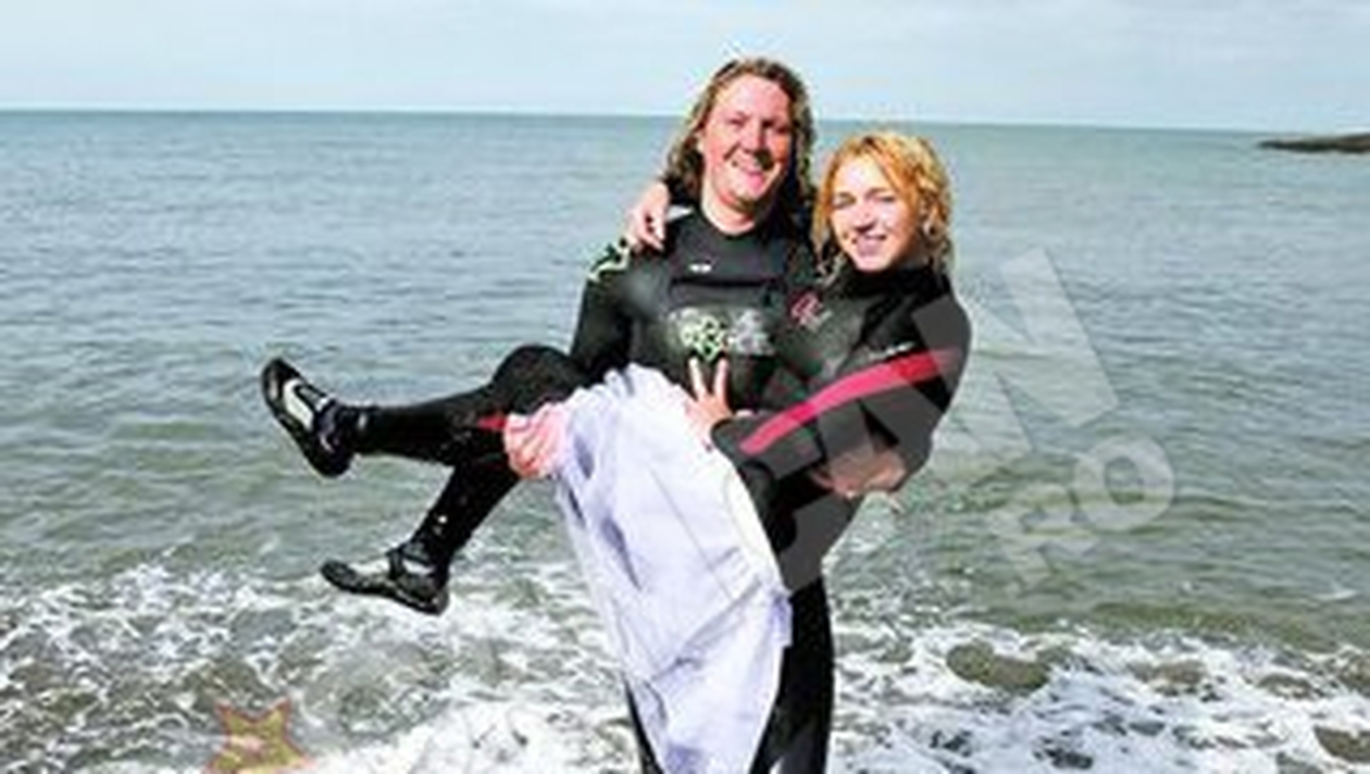 Becky Watkinson, in varsta de 24 de ani, si alesul ei, Samson Hutson, de 26 de ani, nu au fost deloc incantati de cununia civila de care au avut parte, motiv pentru care au decis sa repete ceremonia intr-un stil cu totul aparte. Tinerii, salvamari de profesie, si-au unit destinele pe o stanca inalta de sase metri, aflata la un kilometru distanta in largul marii, la Devon. Cei doi au avut alaturi, la ceremonie, 50 de nuntasi, printre care si bunicul in varsta de 80 de ani al miresei. Toti invitatii au fost nevoiti sa poarte costume speciale, pentru ca au parcurs inot drumul de la mal la roca din mijlocul marii. Desi nu stiu sa inoate, unii nuntasi nu au vrut sa rateze evenimentul, motiv pentru care au fost dotati cu veste de salvare si au facut pluta pana la locul faptei. Mireasa si domnisoarele ei de onoare au fost cele care au fost un pic altfel fata de ceilalti, ele purtand cate un tutu peste costumele de inot. Dupa ce au facut schimb de juraminte, Becky si Samson s-au aruncat in mare din varful stancii si s-au indreptat spre uscat, urmati de alaiul lor, impreuna cu care au mers la restaurant pentru petrecerea de rigoare. „Pentru noi, aceasta este adevarata zi a nuntii, pentru ca aici ne-am dorit noi sa ne casatorim. Cununia civila a fost atat de plictisitoare…”, a povestit mireasa, inainte sa porneasca inot spre stanca. „Bunicul e foarte incantat sI, din fericire, se tine bine pentru varsta lui – merge sa inoate o data pe saptamana sI se plimba mereu cu bicicleta”, a mai spus Becky. Totusi, nu toata lumea a fost la fel de incantata de idee ca bunicul miresei. „Bunica m-a facut sa rad atat de tare… Mi-a spus: ‘La 75 de ani, ma consider ‘antica’ sI nici nu ma gandesc sa ma bag intr-un costum de scafandru”, a povestit Becky. Pana la urma, bunica a fost dusa cu barca pana la stanca sI si-a putut vedea nepoata maritandu-se.