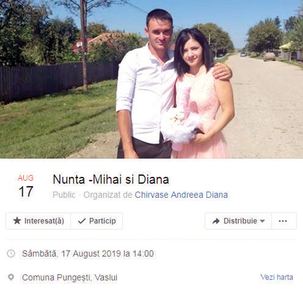 ”Noi, Mihai si Diana, ne-am gândit sã vã dãm de veste cã pe data de 17 august 2019, ne vom uni destinele pentru totdeauna si în fata lui Dumnezeu. Cununia va avea loc la Biserica “Sf. Alexandru” din comuna Pungesti, unde ne vom spune cel mai frumos “DA”. Alãturi de noi vor fi scumpii nostri pãrinti, Mihai si Doina & Vasile si Daniela. Martori ai acestei iubiri, ce au promis cã ne vor sustine si ne vor fi alãturi sunt Mihaela si Rãzvan Toloacã. Fãrã ezitare dorim ca si dumneavoastrã sã ne fiti alãturi în aceastã zi specialã. Petrecerea de dupã, va avea loc în Silistea, unde ne vom distra pânã în zori”, se aratã în descrierea evenimentului.