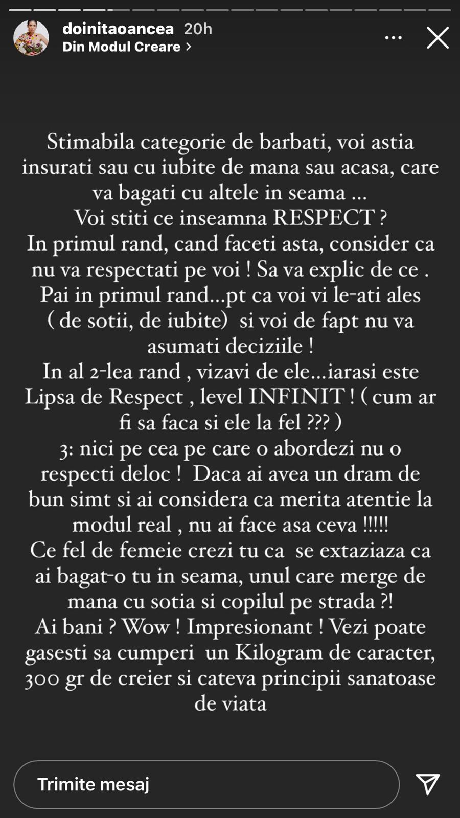Ei nu ştiu ce înseamnă ăla RESPECT, dar din păcate sunt foarte multe femei care se mulţumesc cu firimiturile. La mine nu există aşa ceva. Eu nu sunt genul, o ciorbă, o distracţie”, ne-a declarat Doniţa Oancea.