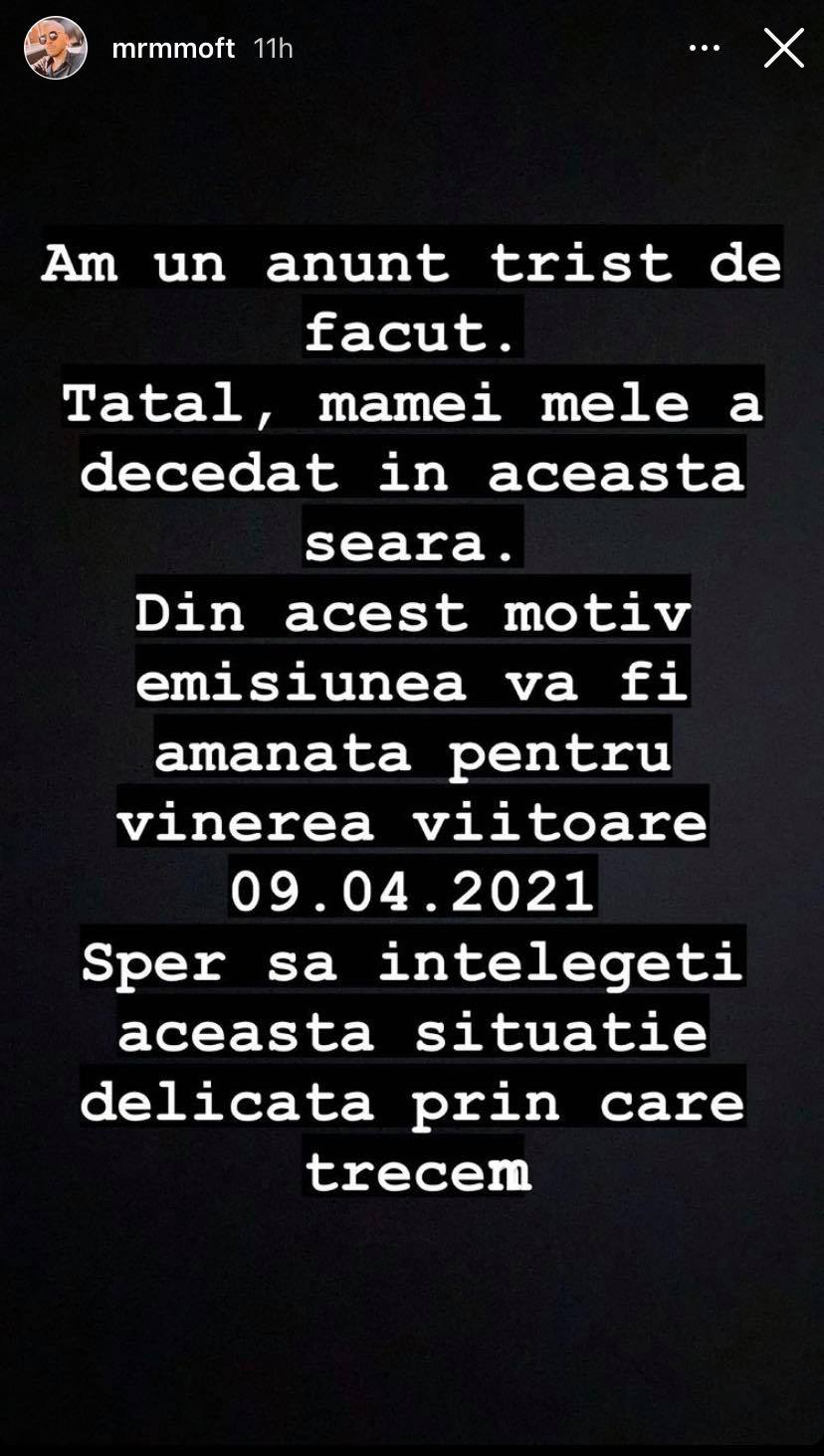 „Am un anunț trist de făcut. Tatăl mamei mele a decedat în această seară. Din acest motiv, emisiunea va fi amânată pentru vinerea viitoare, 09.04.2021. Sper să înțelegeți această situație delicate prin care trecem”, a scris Fulgy pe Instagram.