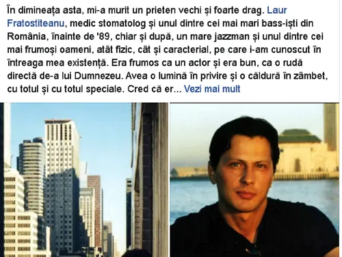 ”În dimineața asta, mi-a murit un prieten vechi și foarte drag. Laur Fratostiteanu, medic stomatolog și unul dintre cei mai mari bass-iști din România, înainte de ’89, chiar și după, un mare jazzman și unul dintre cei mai frumoși oameni, atât fizic, cât și caracterial, pe care i-am cunoscut în întreaga mea existență.