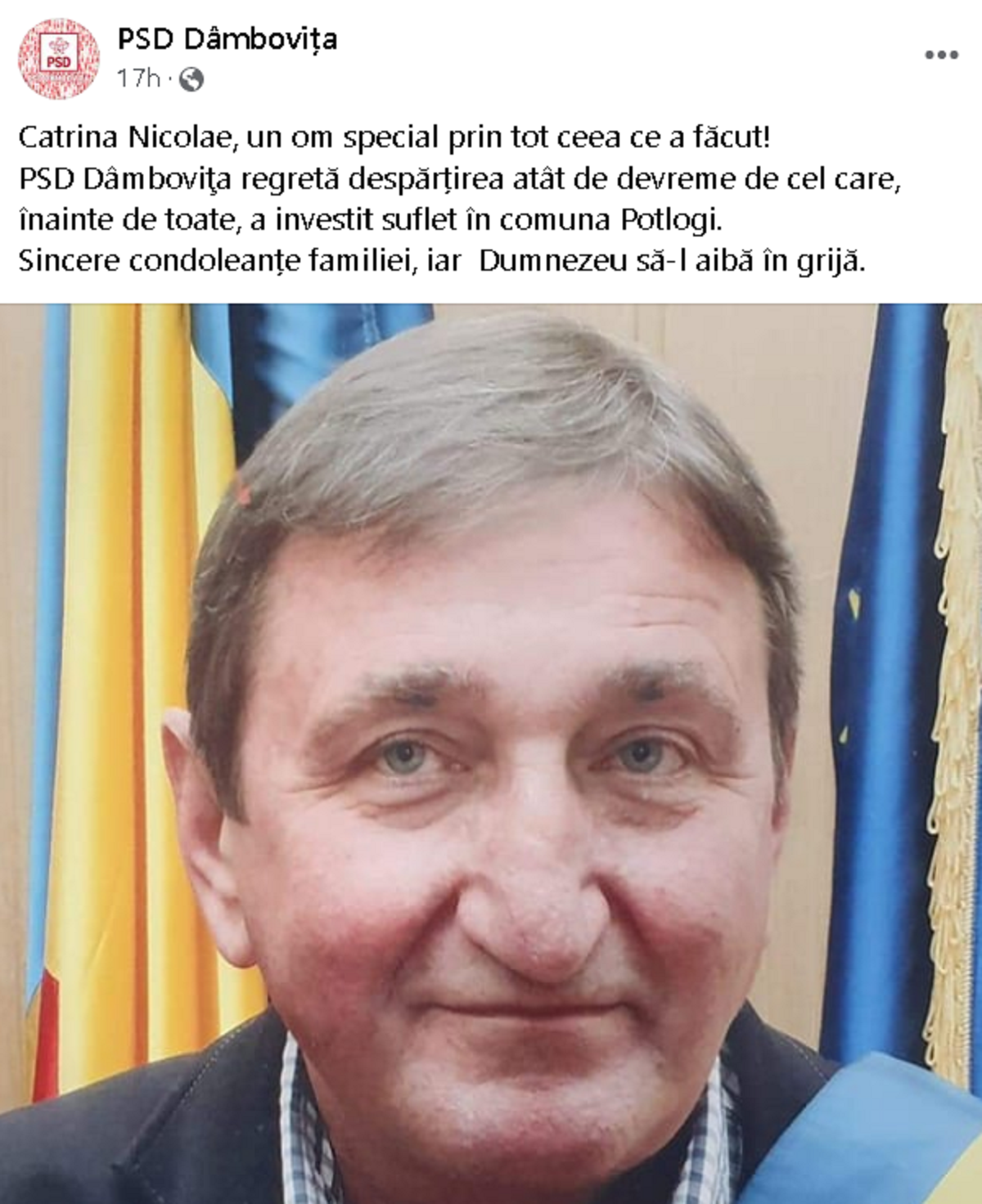 ”Catrina Nicolae, un om special prin tot ceea ce a făcut! PSD Dâmboviţa regretă despărțirea atât de devreme de cel care, înainte de toate, a investit suflet în comuna Potlogi.
