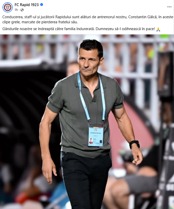 „Conducerea, staff-ul și jucătorii Rapidului sunt alături de antrenorul nostru, Constantin Gâlcă, în aceste clipe grele, marcate de pierderea fratelui său. Gândurile noastre se îndreaptă către familia îndurerată. Dumnezeu să-l odihnească în pace! ”, a fost mesajul postat pe pagina oficială de Facebook a clubului Rapid București.
