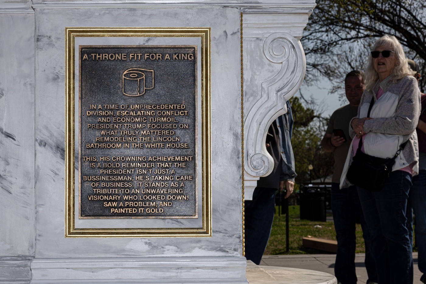 „Un tron ​​demn de un rege. Într-o perioadă de diviziune fără precedent, conflict și turbulențe economice, președintele Trump s-a concentrat pe ceea ce conta cu adevărat: remodelarea băii Lincoln din Casa Albă. Aceasta, realizarea sa cea mai importantă, este o amintire îndrăzneață a faptului că președintele nu este doar un om de afaceri, ci se ocupă de problemele importante. Reprezintă un omagiu adus unui vizionar de neclintit care a privit în jos, a văzut o problemă și a vopsit-o în aur”, este scris pe plăcuța care descrie opera de artă.