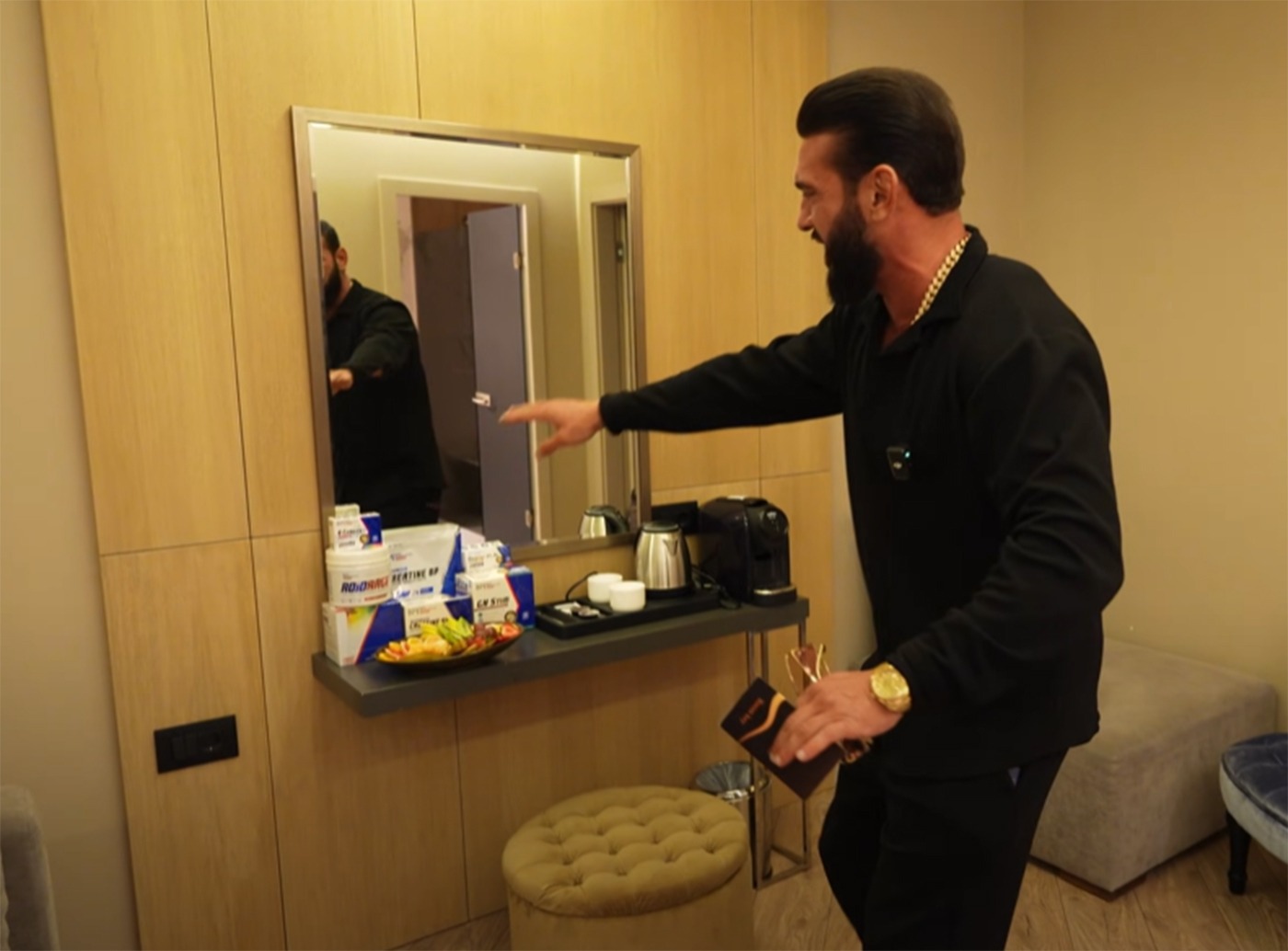 „Super apartament, cu canapeluță, fructe aici (…) Asta este băița! Cât de bine arată hotelul! Senzațional! Cât de tare este treaba asta cu gresie cu textură de lemn pe pereți. Aici oglinjoară, cu chiuvețică. O chestie foarte interesantă, ușile din sticlă sablată colorată. Dușul aici, la fel, cu aceeași sticlă închisă la culoare, care mi se pare tare, că pe deoparte pare și oglinjoară. Dormitorescu mare și generos! Pătuțul, pentru că suntem treziți de la 7 dimineața, să vă zic și vouă”, a mărturisit Dorian Popa pe YouTube.