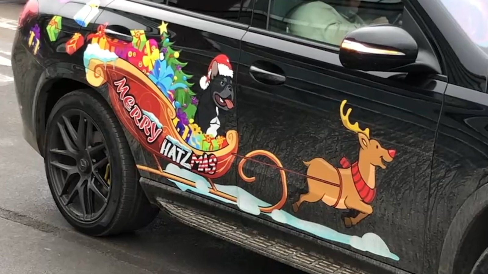 Mai ales că artistul și-a personalizat bolidul în concordanță cu Sărbătorile: cu o pictură inedită cu Cheluțu, într-o sanie trasă de un ren. Dar asta nu este tot! Mesajul de pe pictură face toți banii: „Merry Hâtzmas”.