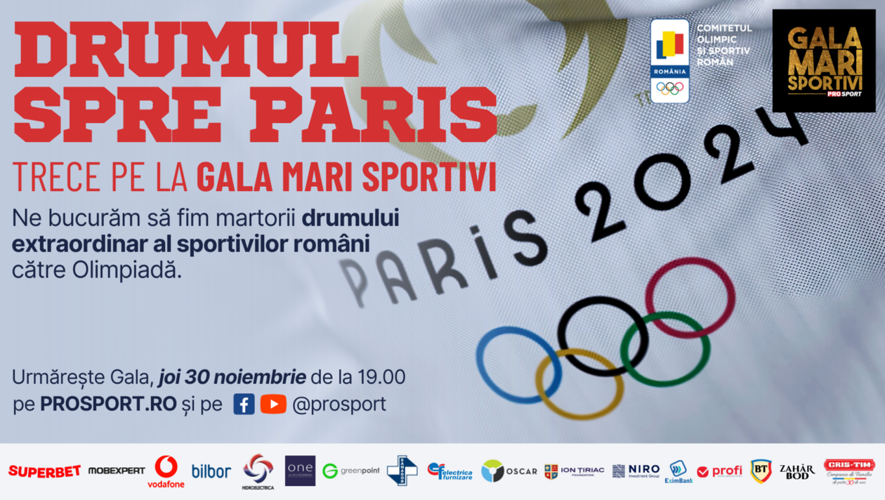 PROSPORT.RO lansează campania de comunicare Drumul spre Paris alături de Comitetul Olimpic și Sportiv Român, campanie dedicată evenimentului Gala Mari Sportivi 2023, un eveniment de excepție care va celebra marile performanțe în sport în 2023 și va premia cei mai buni sportivi ai României. Această gală, organizată de platforma online de știri sportive ProSport în parteneriat cu COSR, va marca un moment semnificativ în calendarul sportiv național și va fi transmisă pe platforma YouTube @ProSport, pe site-ul ProSport.ro și pagina de Facebook @ProSport pe data de 30 noiembrie 2023, începând cu ora 19:00.
