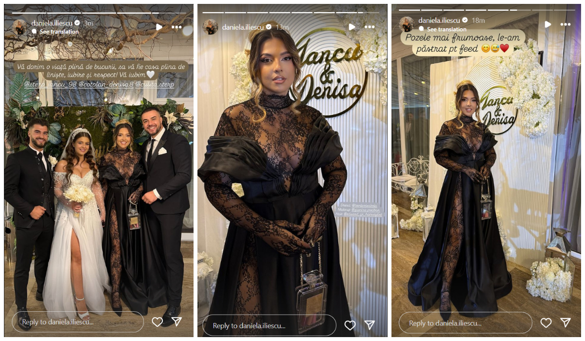 Daniela Iliescu a ales o ținută atipică pentru ziua nunții lui Iancu Sterp. La tradițiile pe care acesta le-a organizat la casa părintească, iubita lui Culiță a purtat un costum negru, elegant, accesorizat cu mult bun gust. Aceasta a reușit să fure toate privirile celor din jur, ca de fiecare dată. S-a ales numai cu mesaje și comentarii frumoase și-n mediul online, acolo unde și-a prezentat ținuta. Doar că, piesa de rezistență a venit în seara nunții, când Daniela a ales să poarte o rochie neagră, foarte sexy, care i-a pus în evidență silueta. Ținuta ei i-a cucerit pe toți, iar laudele au început să curgă!