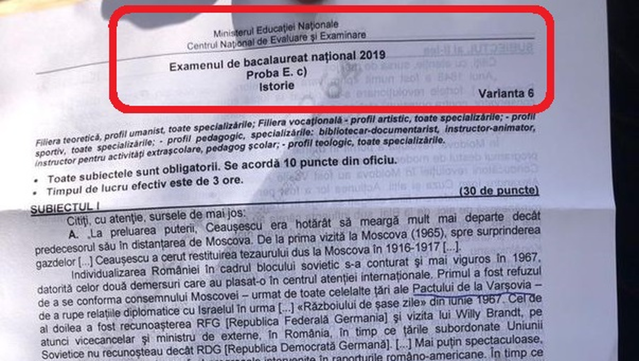 UPDATE 11:40 – La primul subiect, elevii au primit epoca lui Nicolae Ceauşescu, la cel de-al doilea, Revoluţia de la 1948, iar la ultimul punct â, un eseu pe tema autonomiei locale şi institutiilor centrale în spaţiul românesc secolele IX-XV.
