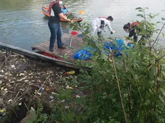 Voluntarii au amenajat un baraj şi, cu ajutorul unor bărci, au strâns tone de deşeuri de pe Jiu.