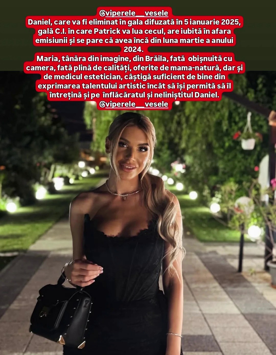 „Daniel, care va fi eliminat în gala difuzată în 5 ianuarie 2025, gală Casa Iubirii în care Patrick va lua cecul, are iubită în afara emisiunii și se pare că avea încă din luna martie a anului 2024. Maria, tânăra din imagine, din Brăila, fată obișnuită cu camera, fată plină de calități, oferite de mamă-natură, dar și de medicul estetician, câștigă suficient de bine din exprimarea talentului artistic încât să își permită să îl întrețină și pe înflăcăratul și neliniștitul Daniel.”, a transmis pagina de Instagram Viperele Vesele.