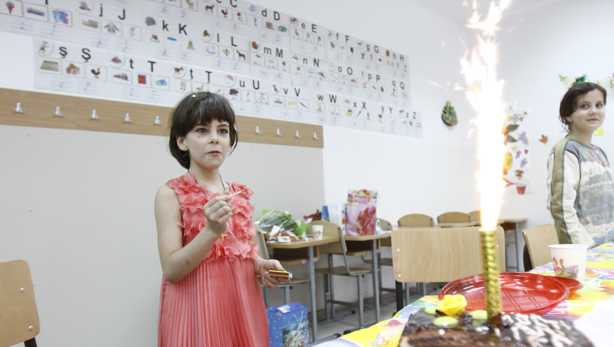 Eliza, fiica Adrianei Iliescu (74 de ani), cea mai batrana mama din Romania, a implinit astazi 8 ani. Micuta si-a aniversat ziua de nastere la scoala, alaturi de colegi, de profesori, dar si de mama sa.
