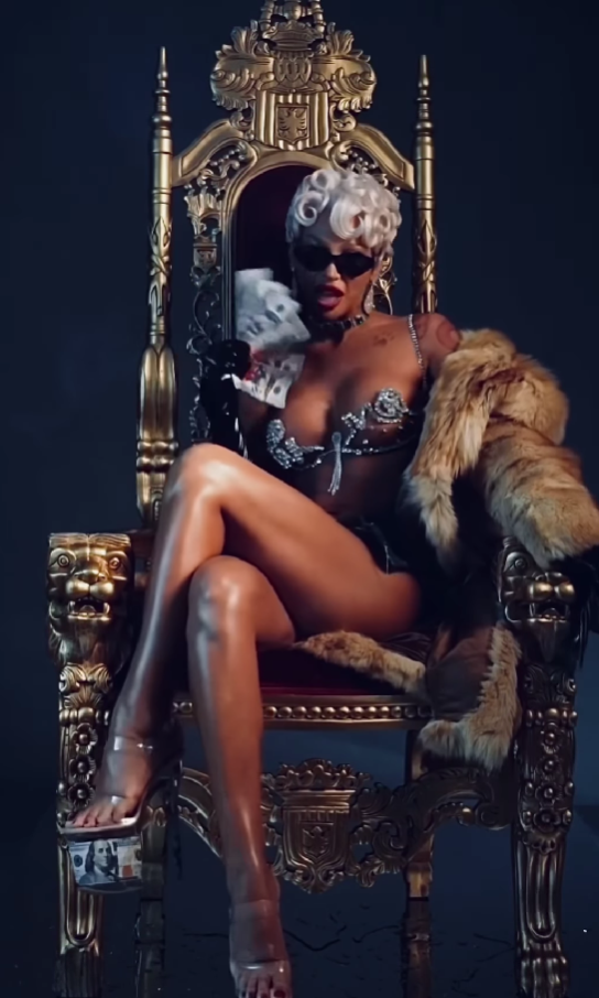 Look-ul a fost completat de o haină de blană, o pereche de mănuși negre și ochelari de soare. Așezată pe un scaun de „regină”, Ema Uta s-a filmat pe o melodie interpretată de Rihanna, în timp ce învârtea bancnotele. Reacțiile fanilor nu au întârziat să apară.