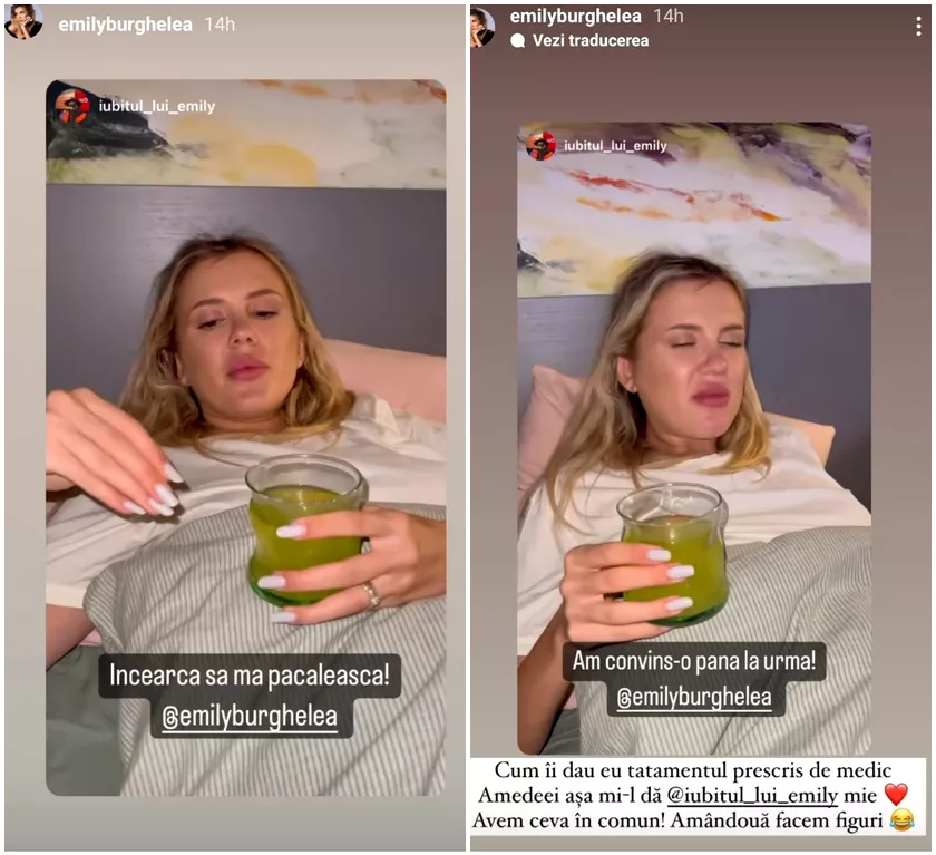 Am primit de la doctor un tratament permis în sarcină, credeam că pot să trec peste fără ele, dar se pare că e necesar.”, a scris Emily Burghelea, după ce soțul a reușit să o convingă să-și ia pastilele.