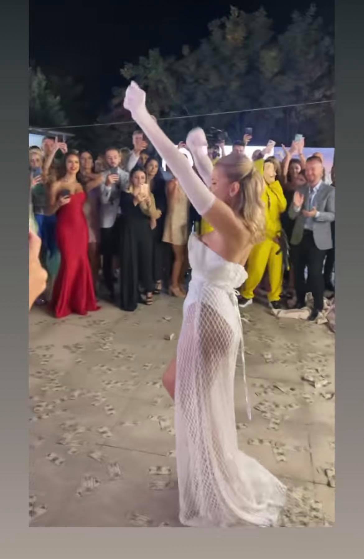 Blondina a ales pentru finalul petrecerii să poarte un body, iar pe deasupra a avut prins într-o curea un material preţios, însă extrem de transparent. Cu siguranţă tânăra a reuşit să întoarcă toate privirile şi să câştige titlul de „cea mai sexy mireasă din showbiz”!
