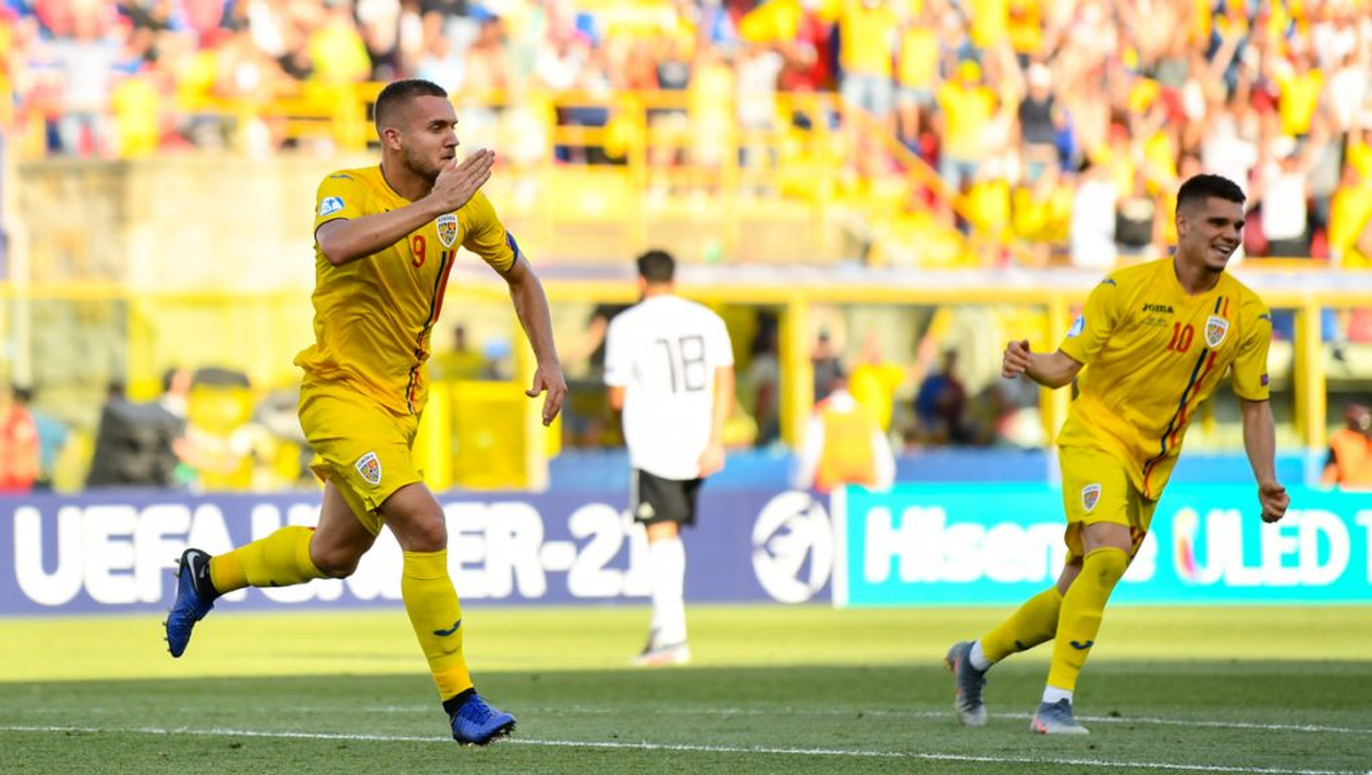 BOLOGNA, ITALY - June 27: George Puscas of Romania celebrates after scoring his side's second goal during the 2019 UEFA U21 Championships semi-final match between Germany and Romania at Renato Dall'Ara on June 27, 2019, in Bologna, Italy. (Photo by Stephen McCarthy - UEFA/UEFA via Sportsfile)
