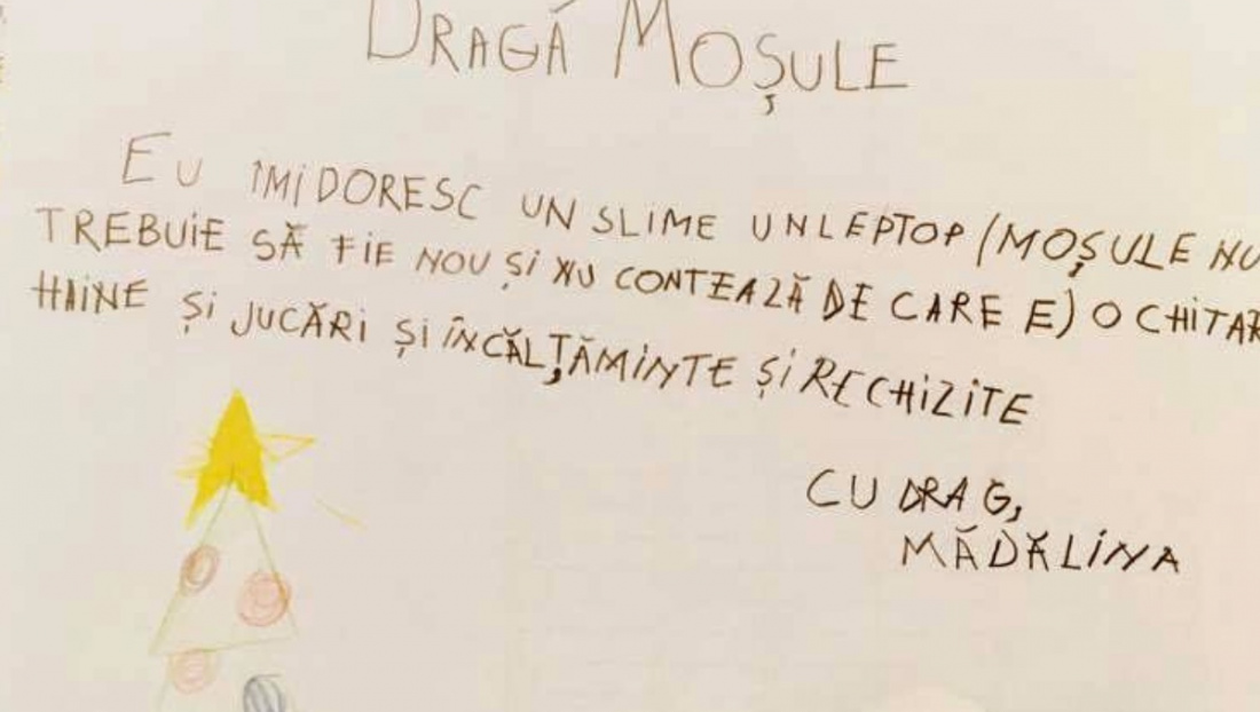 „Dragă Moș Crăciun, Eu sunt Victor și mai am un pic și împlinesc 6 anișori. Vreau să îți spun că am fost cuminte și te-aș ruga dacă poți să îmi aduci un joc cu patrula cățelușilor. Îți mulțumesc Moșule și te aștept cu drag. Victor”. Așa sună una dintre zecile de scrisori strânse de la copiii familiilor sărace din România.
