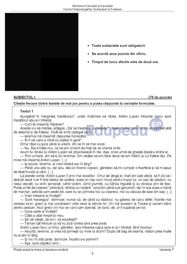 Subiectul I – Test de înțelegere și analiză a textului