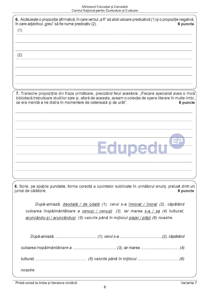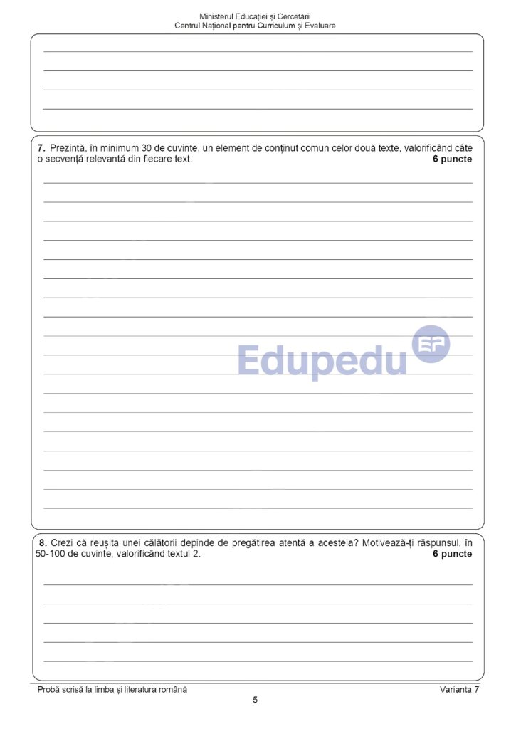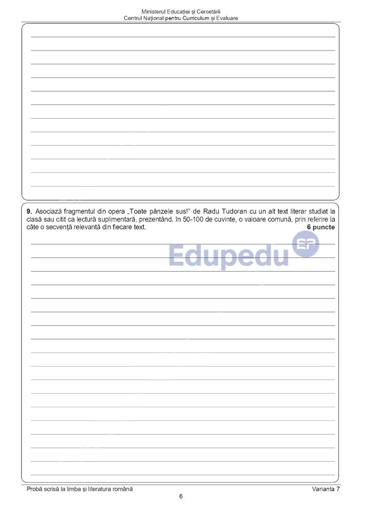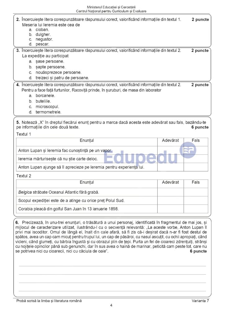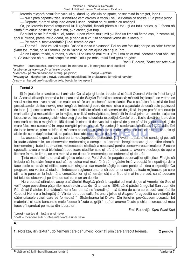UPDATE 11:00: Subiectele pe care elevii le-au primit la proba scrisă de la Limba și literatura română au fost publicate pe edu.ro. Aceștia au avut două texte suport: primul din Radu Tudoran – „Toate pânzele sus!” și al doilea din Emil Racoviță – „Spre Polul Sud”. Pe baza acestor texte, elevii au avut de rezolvat mai multe cerințe. La subiectul al II-lea, aceștia au avut o compunere, de minimum 150 de cuvinte, în care să prezinte o întâmplare dintr-o excursie. Iată mai jos subiectele pe care le-au primit elevii la Evaluarea Națională 2025.