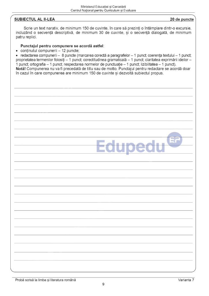 Pentru această parte, care valorează 20 de puncte, elevii trebuie să redacteze un text de minimum 150 de cuvinte. Cerințele pot include realizarea unei compuneri, caracterizarea unui personaj sau exprimarea unei opinii argumentate pe baza unuia dintre textele analizate anterior.