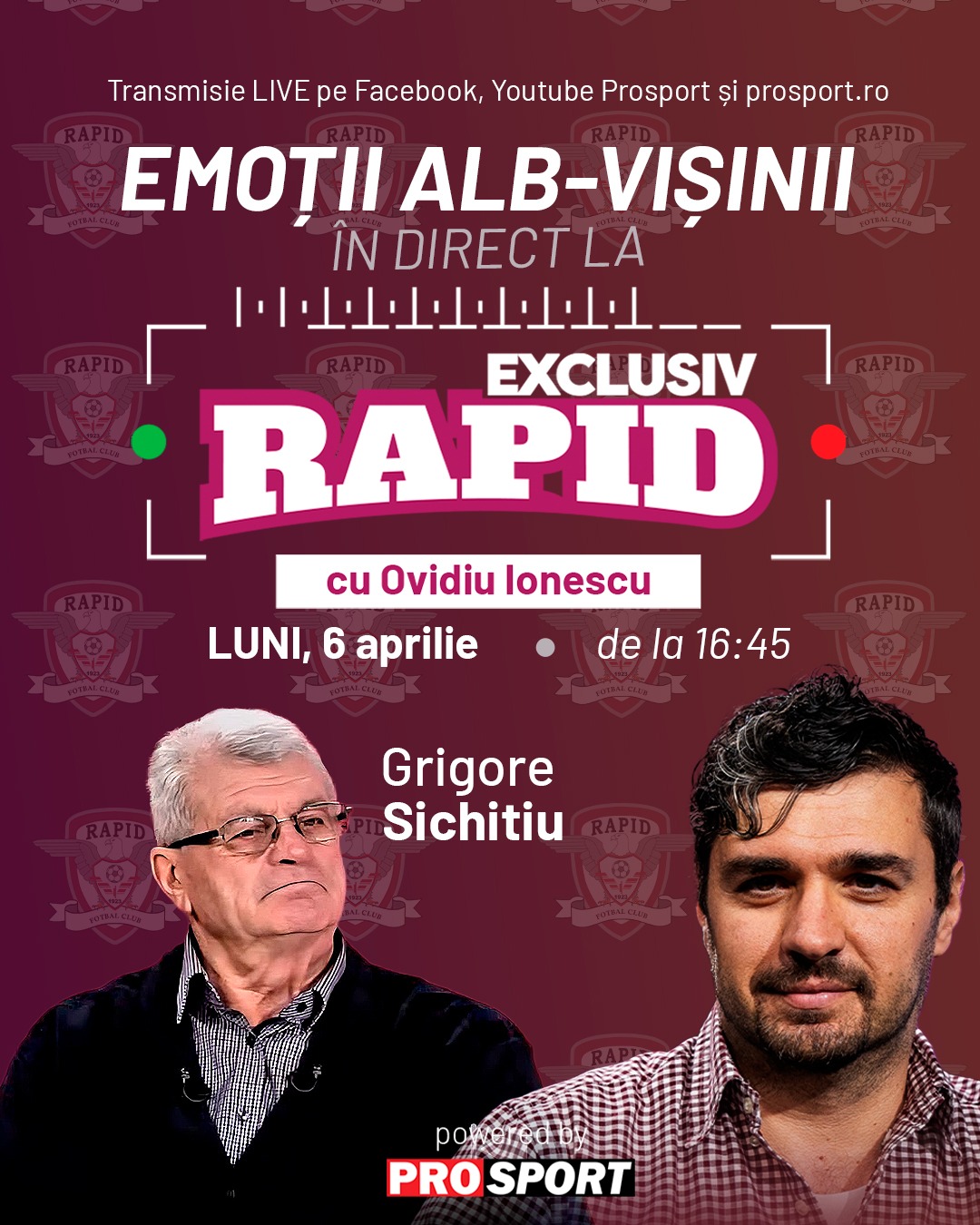 Ne vedem astăzi la „EXCLUSIV RAPID”, în direct pe YouTube – ProSport, de la ora 16:45, alaturi de Grigore Sichitiu!