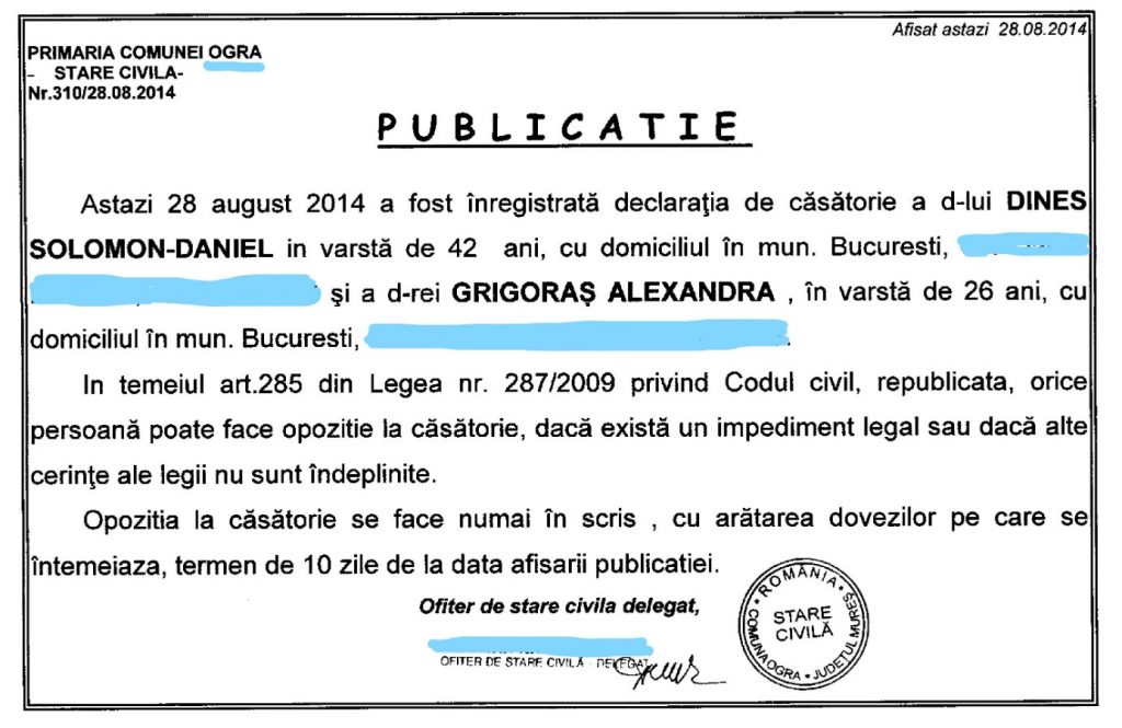 Daniel Dines divorțase, în luna martie a anului 2013, așa că a decis să își refacă viața alături de Alexandra Grigoraș, mai tânără cu 16 ani decât el. Deși cei doi locuiau în București și împărțeau același domiciliu, declarația de căsătorie a cuplului a fost înregistrată, surprinzător, la Primăria Comunei Ogra, județul Mureș. Nu sunt cunoscute motivele pentru care cei doi au recurs la un astfel de demers îndepărtat geografic de localitatea de reședință, însă, firește, au devenit soț și soție, pornind pe un drum comun. (NU RATA: FOSTUL PREZENTATOR DE LA ANTENĂ A DIVORȚAT OFICIAL)