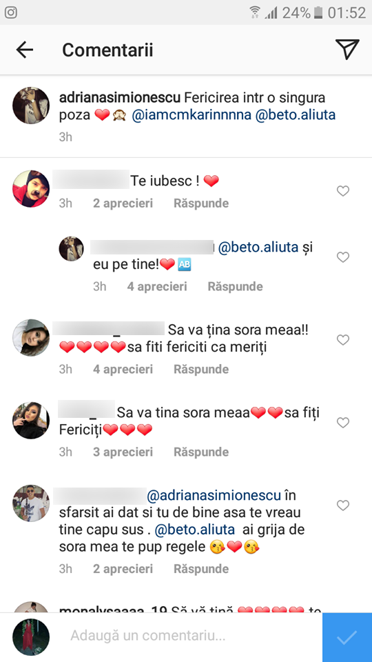 „Foarte frumos cuplu! Mă simt mândră că am ajutat la formarea lui!”, „Să vă ţină, fraţii mei frumoşi!”, „Iubiţii mei!”, „Nu îmi vine să cred ce văăăăd! Te-ai îndrăgostit, nepoţele! Bravo! Mulţi pupici!”, „Să vă ţină, sora mea! Să fiţi fericiţi”, „În sfârşit ai dat şi tu de bine! Aşa te vreau! Ţine capul sus! Ai grijă de tine, te pup!”, au fost doar câteva din comentariile primite de Adriana la poza cu iubitul ei.