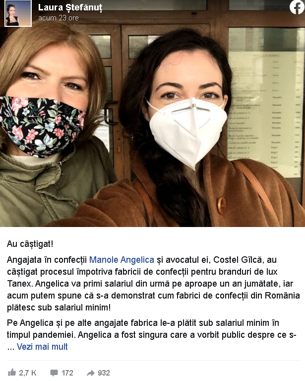 Angelica Manole este fosta angajată a unei firme de confecții pentru branduri de lux din Valenii de Munte, Prahova. Femeia a avut curajul de a publica o fotografie cu ”fluturașul” de salariu în aprlie anul trecut. Angelica Manole a vrut să arate felul în care angajații firmei sunt tratați.