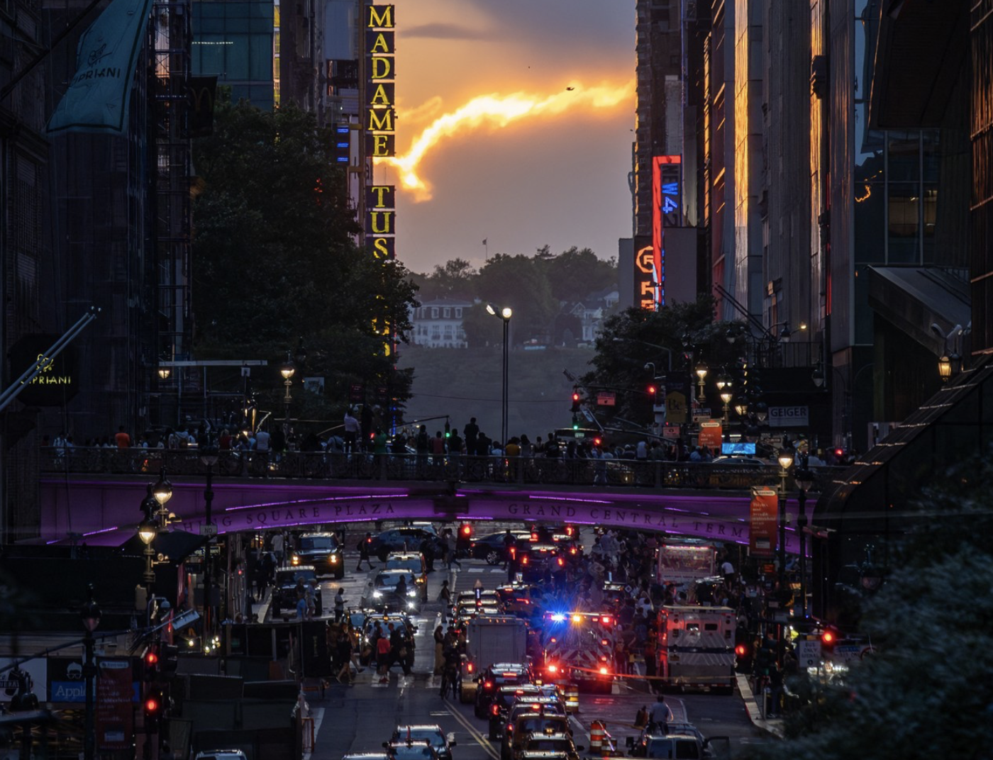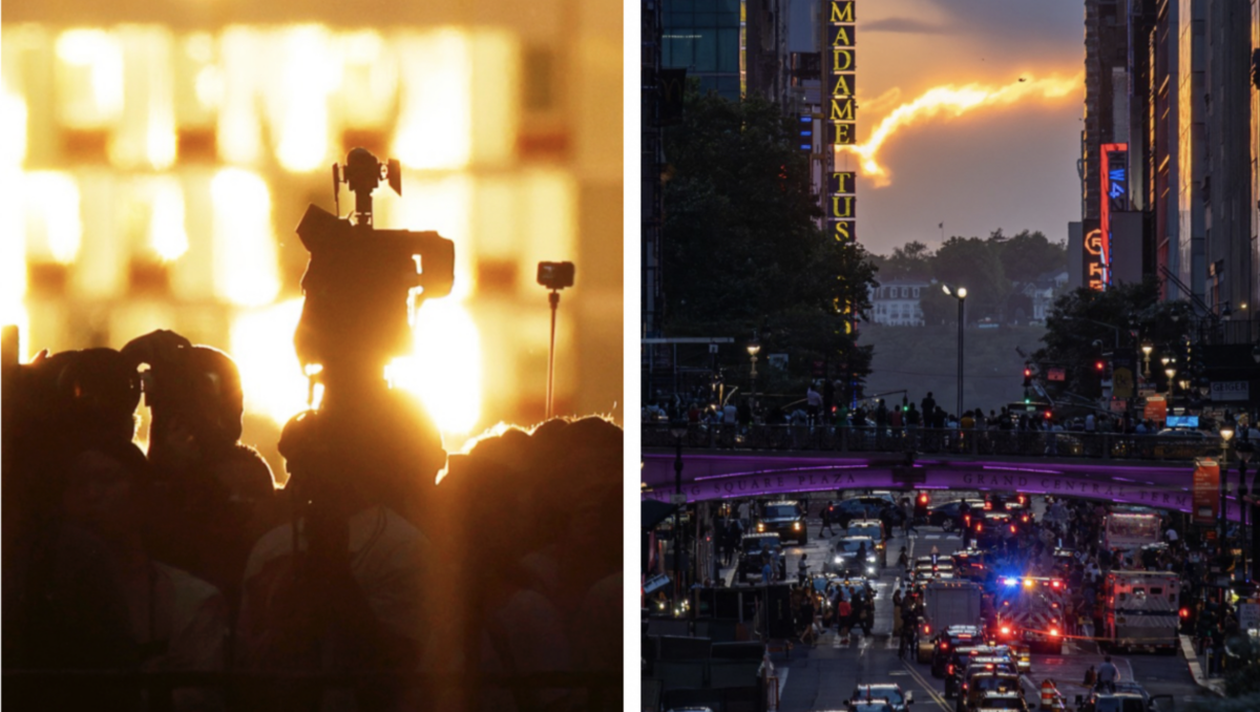 O mulțime de locuitori din New York și-au întrerupt activitățile pentru a captura cu telefoanele și camerele lor un spectacol uimitor: apusul de soare cunoscut sub numele de „Manhattanhenge”. Pe trotuare aglomerate, pe poduri și chiar în mijlocul străzii, oamenii au încercat să surprindă în imagini această priveliște uimitoare.