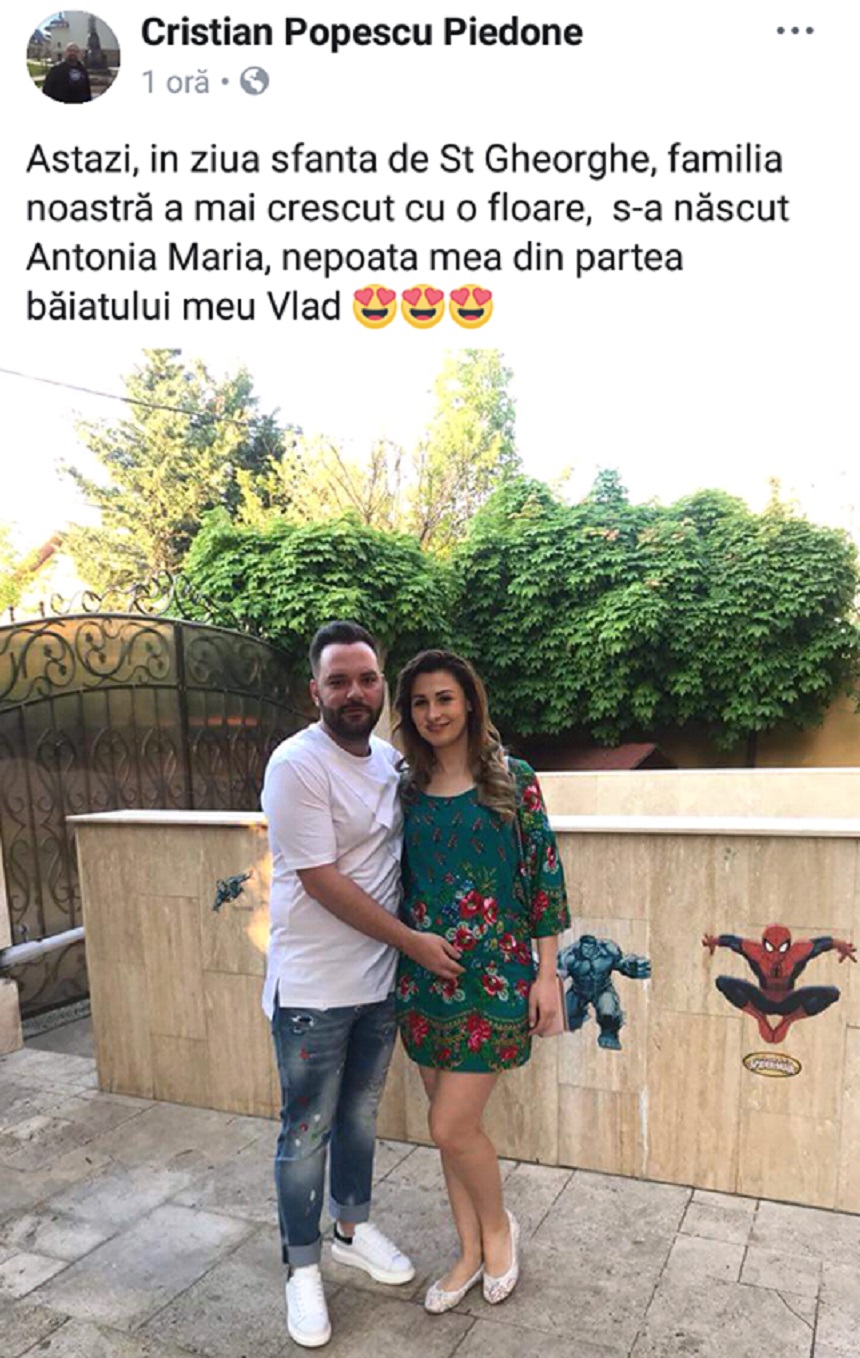 ”Astăzi, în ziua sfântă de St Gheorghe, familia noastră a mai crescut cu o floare, s-a născut Antonia Maria, nepoata mea din partea băiatului meu Vlad”, a fost mesajul postat de Piedone.