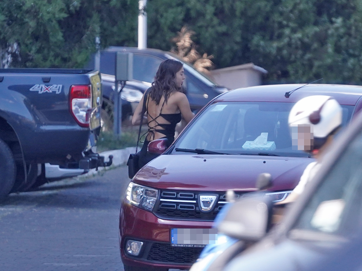 Îmbrăcată lejer, cu o rochie scurtă, neagră și cu o pereche de papuci roz, plus o geantă neagră ca accesoriu, fiica lui Mihai Stoica a urcat pe bancheta din spate a mașinii care a preluat-o și a dus-o fix în locul în care își lăsase bolidul.
