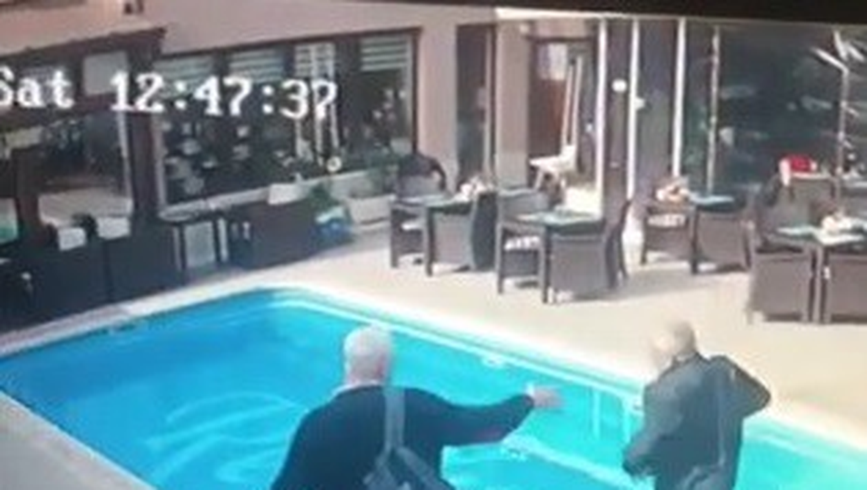 De-a râsu’-plânsu’!  Un inspector ANAF a căzut în piscina unui restaurant pe care îl controla, în Constanţa. Pe filmare se observă cum bărbatul intră în local, extrem de hotărât, și cade în piscina restaurantului pe care nu a văzut-o. Zadarnic, celălalt coleg a încercat să-l atenționeze.
