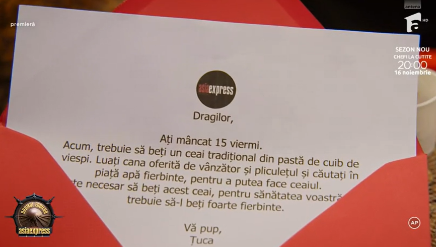 UPDATE 21:30 – Deși sunt în avantaj, Dan Alexa și Gabi Tamaș au fost copleșiți de presiunea probei și au întâmpinat probleme. Au cerut ajutorul localnicilor pentru a ajunge la standul unui localnic, unde au avut misiunea de a mânca 15 viermi. Pentru a obține alt cod, în următoarea probă au avut de băut un ceai tradițional din pastă de cuib de viespi. Pentru a îl prepara, aceștia au primit o cană cu ceaiul, dar au fost nevoiți să alerge după apă fierbinte.