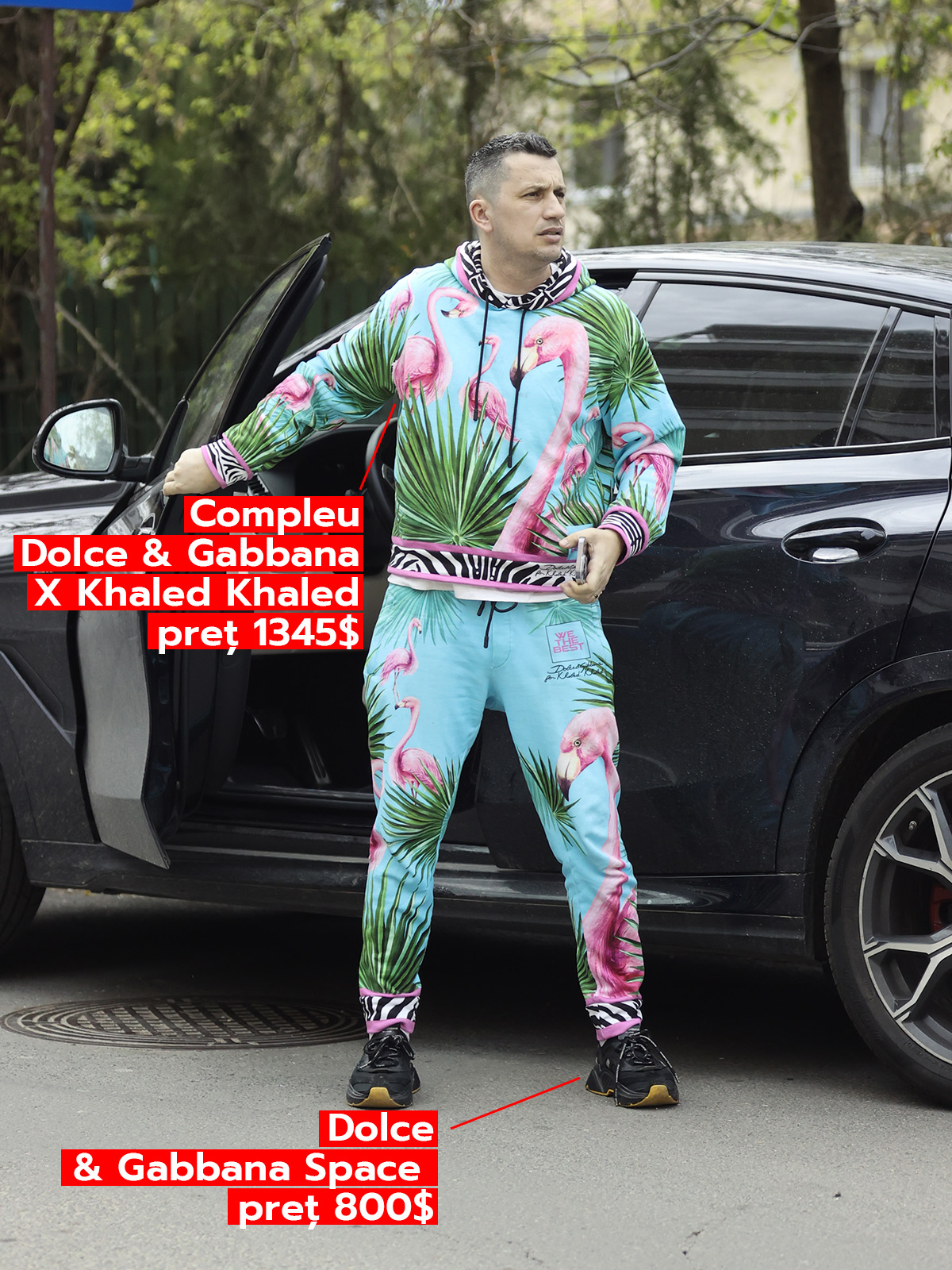 Ei bine, așa cum ați putut descifra în imaginea prezentată mai sus, Sebastian Filcea a decis că este momentul să fie excentric. A deschis ușa dressingului și a pus mâna pe unul dintre cele mai insolite piese vestimentare – un compleu realizat de Dj Khaled în colaborare cu Dolce & Gabbana. Prețul pentru un asemenea trening ajunge la 1345 $, semn că extravaganța se plătește scump. Tot Dolce & Gabbana sunt și pantofii sport ai vedetei, achiziționați pentru suma de 800 $. Toate astea pentru ca familistul convins să se simtă lejer când o plimbă pe Eva alături de soție.