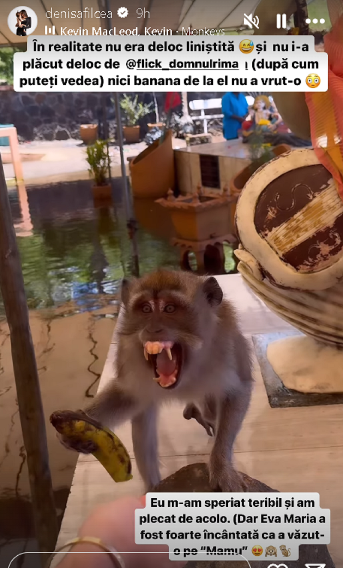 „Mă bucur enorm de experiența pe care o trăiesc alături de Eva Maria. A văzut aici absolut toate animalele ei preferate din cărticelele de acasă. Are o carte cu melc pe care și-a ales-o pentru bagaj și a văzut aici și melci. Ea singură i-a văzut și ni i-a arătat nouă. Încă de acasă, i-am spus că aici vom vedea maimuțe, însă la Zoo era închis la maimuțe pentru că le mutau în altă parte. Așadar, ieri am explorat insula în căutarea maimuțelor. Vreau ca tot ce îi promit să mă țin de cuvânt și să nu o mint/păcălesc cu absolut nimic. Am ajuns la un loc sacru pentru Hinduși (ei vin aici să aducă ofrande și să se roage zeilor), unde am găsit această maimuță aparent liniștită. În realitate, nu era deloc liniștită și nu i-a plăcut deloc de Flick (după cum puteți vedea), nici banana de la el nu a vrut-o.”, povestește Denisa pe Instagram.