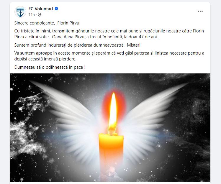 Cu tristețe în inimi, transmitem gândurile noastre cele mai bune și rugăciunile noastre către Florin Pîrvu a cărui soție, Oana Alina Pîrvu, a trecut în neființă, la doar 47 de ani. Suntem profund îndurerați de pierderea dumneavoastră, Mister!Vă suntem aproape în aceste momente și sperăm că veți găsi puterea și liniștea necesare pentru a depăși această imensă pierdere. Dumnezeu să o odihnească în pace!”, se arată în mesajul de pe Facebook.