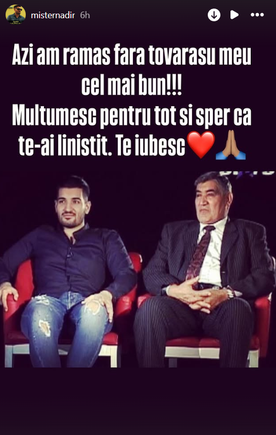„Azi am rămas fără tovarășul meu cel mai bun! Mulțumesc pentru tot și sper că te-ai liniștit. Te iubesc!”, a scris Nadir pe Instagram.