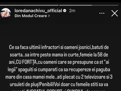 „M-am săturat să tac și să rabd! Din luna martie de când am obținut ordinul de protecție împotriva celui mai diabolic om, au continuat amenințările, șantajele, abuzurile, râsuri de toate felurile! Până astăzi când au intrat cu forța în casa mamei mele! Nu vreau să tac și să încurajez comportamentele astea bolnave! Credeam că legea e de partea mea (…) Sper să se sesizeze în cazul meu și poliția și toate organele competente (…) Cum e posibil în 2023 să intri cu forța în casa mamei mele, cu jandarmi, cu bodyguard, care îi transmitea lui pe cameră lui (n.r. numele iubitului) cum o umilea pe mama mea?”, a mai spus Loredana Chivu, pe Instagram.