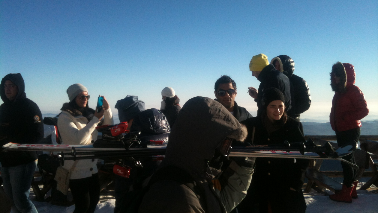 Nu a stat prea mult afara, pentru ca a venit la munte imbracat subtire si incaltat in pantofi. A facut totusi doua fotografii si s-a intors rapid in cabana, la masa rezervata lui si grupului cu care a venit.