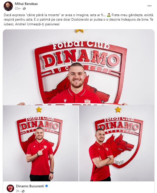 „OFICIAL! Clubul Dinamo 1948 București, prin intermediul rețelelor de socializare oficiale, este entuziasmat să anunțe că Andrei Bendeac, cunoscut de dinamoviști drept „Bendy”, câine roșu la rândul lui, face oficial parte din staff-ul administrativ al clubului.