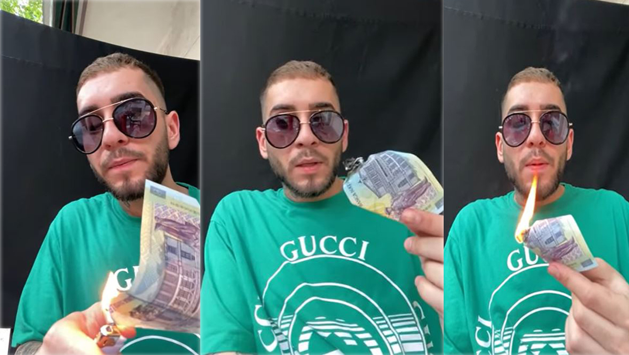 Au trecut doar câteva zile de când controversatul artist a părăsit clinica de reabilitare în care a fost internat după episodul în care a fost prins drogat la volan. Deși a cerut public să nu mai fie căutat de jurnaliști, în realitate, el vrea să rămână în centrul atenției tuturor. Astfel, în timpul unui live făcut pe canalul său de YouTube, băiatul Vioricăi de la Clejani a dat foc unei bancnote de 100 de lei cu ajutorul unei brichete, după cum puteți remarca pe video-ul de mai jos la minutul 26 și 11 secunde. Totul a pornit după ce i-a provocat pe urmăritorii lui să îi trimită 100 de euro.