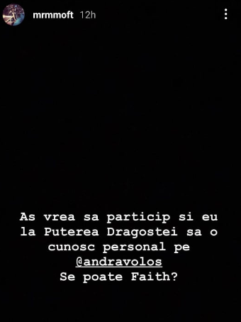 „Aș vrea să particip și eu la Puterea Dragostei și să o cunosc personal pe Andra Volos. Se poate Faith?”, a fost mesajul lui Fulgy.