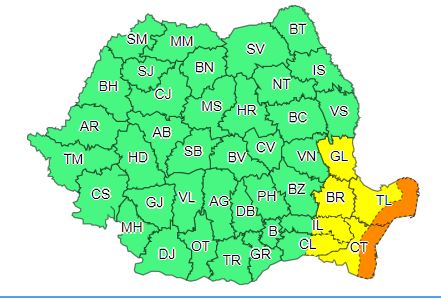 Zona de litoral a județelor Constanța și Tulcea se află, de la ora 10.00 sub cod portocaliu de ploi puternice. Cantitățile de apă vor ajunge la 60 l/mp. Meteorologii au emis și un Cod galben de averse și vijelii pentru Dobrogea, estul Munteniei și sudul Moldovei.