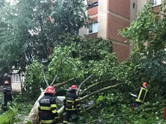 Furtună puternică în Tulcea. Șapte pomi s-au prăbușit peste patru mașini staționate pe străzi. Pompierii au intervenit cu dificultate pentru înlăturarea arborilor.