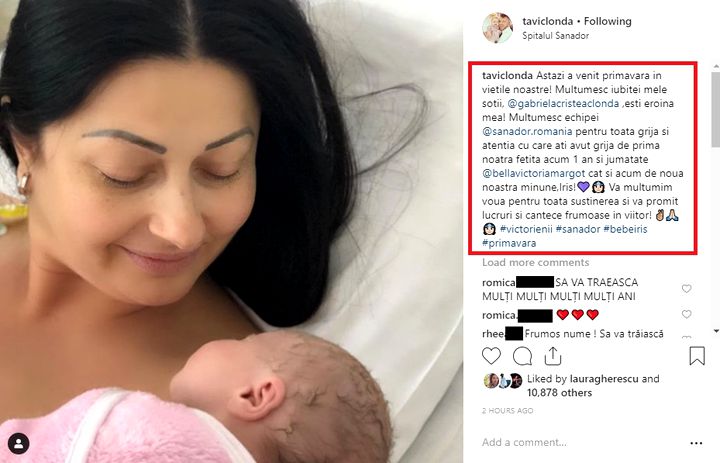 “De azi, primăvara pentru noi înseamnă Iris! ????? Mulțumim echipei Sanador pentru grija pe care o purtați mămicilor și bebelușilor! Totul a decurs perfect atât pentru mine, cât și pentru bebe Iris! O primăvară însorită tuturor și mulțumim pentru toate mesajele și gândurile bune! ?☀️ Tavi Clonda #bebeiris #sanador #victorienii”. Tavi Clonda și Gabriela Cristea mai au o fetiță, care are un an și jumătate.