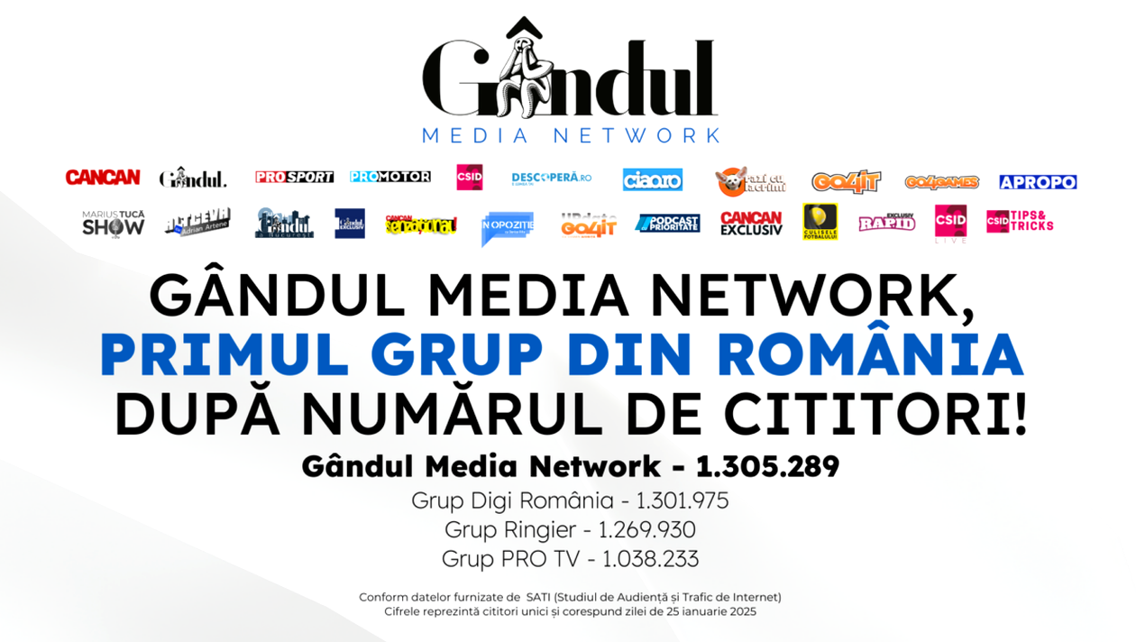 Gândul Media Network este din nou grupul de presă nr. 1 din România. Sâmbătă, 25 ianuarie 2025, site-urile din cadrul grupului au înregistrat, în total, cel mai mare număr de clienți unici, devansând grupuri precum Digi România, Ringier, Pro TV și Adevărul.