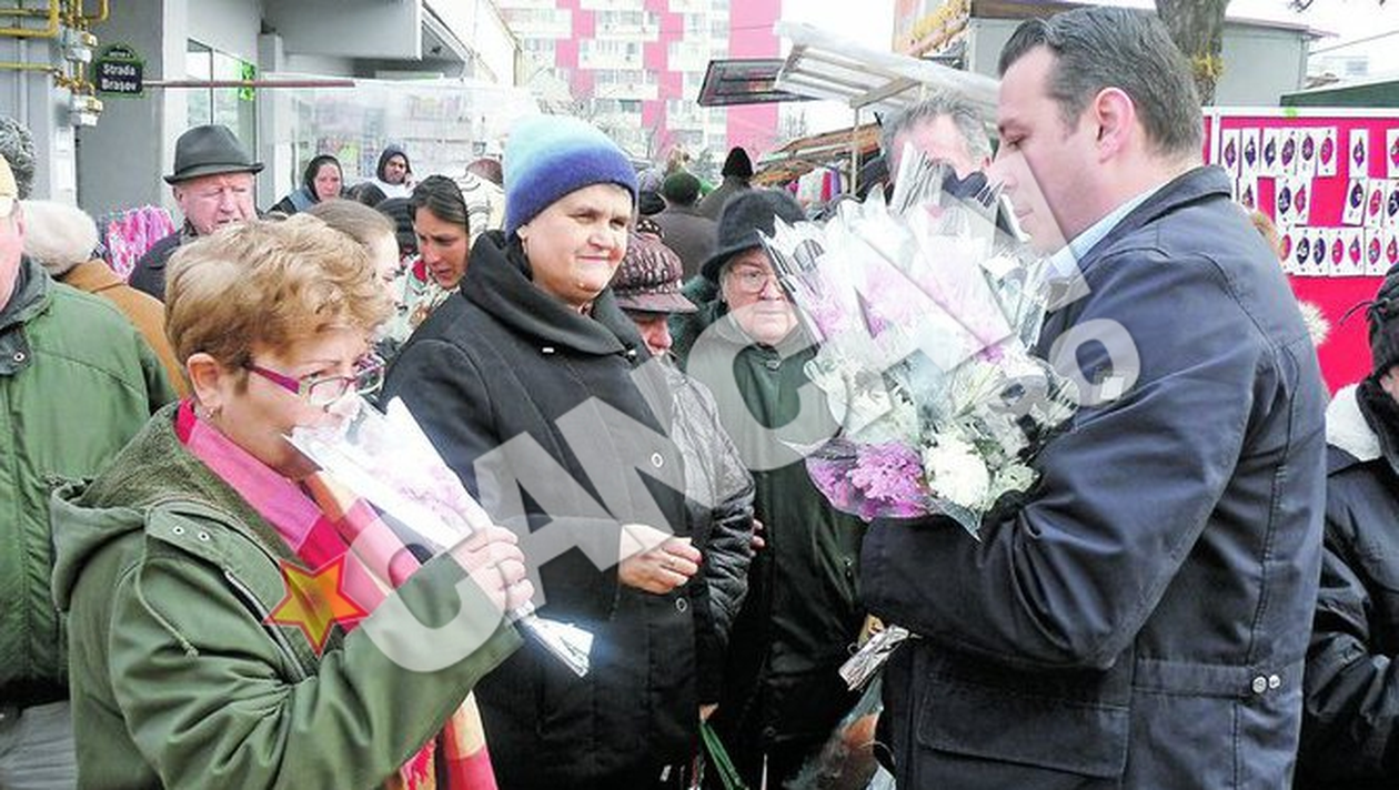 Presedintele Fundatiei "Din suflet, pentru suflet", Stefan Florescu, a impartit, de 8 Martie, flori tuturor doamnelor si domnisoarelor care i-au iesit in cale.