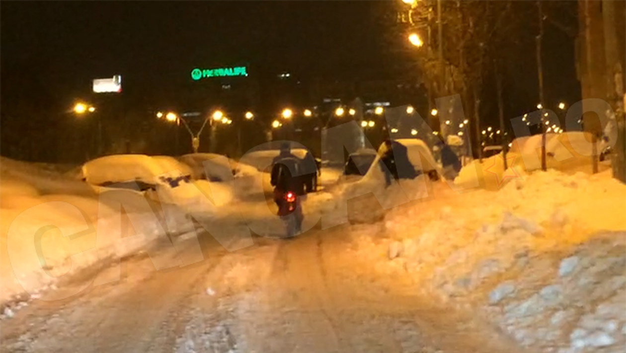 Cu toate că ninsoarea s-a aşternut din plin pe şosea, un bărbat nu a ţinut cont de acest lucru şi a mers cu bicicleta.