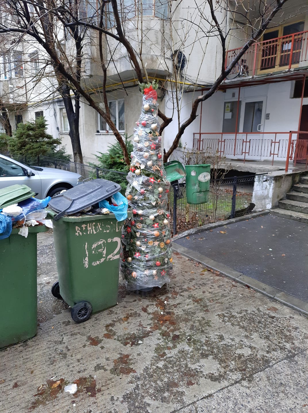 Mai exact, un bucureștean a aruncat la gunoi bradul complet împodobit, poziționat vertical, dar și înfășurat în folie alimentară, astfel încât cineva să se mai poată bucura de el, dacă dorește.